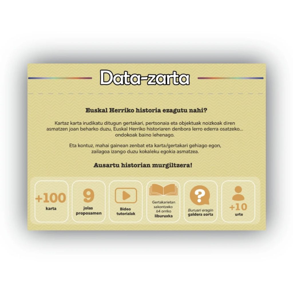 Kartaz karta irudikatu dituzten gertakari, pertsonaia eta objektuak noizkoak diren asmatzen joan beharko duzu, Euskal Herriko historiaren denbora-lerro ederra osatzeko… ondokoak baino lehenago.